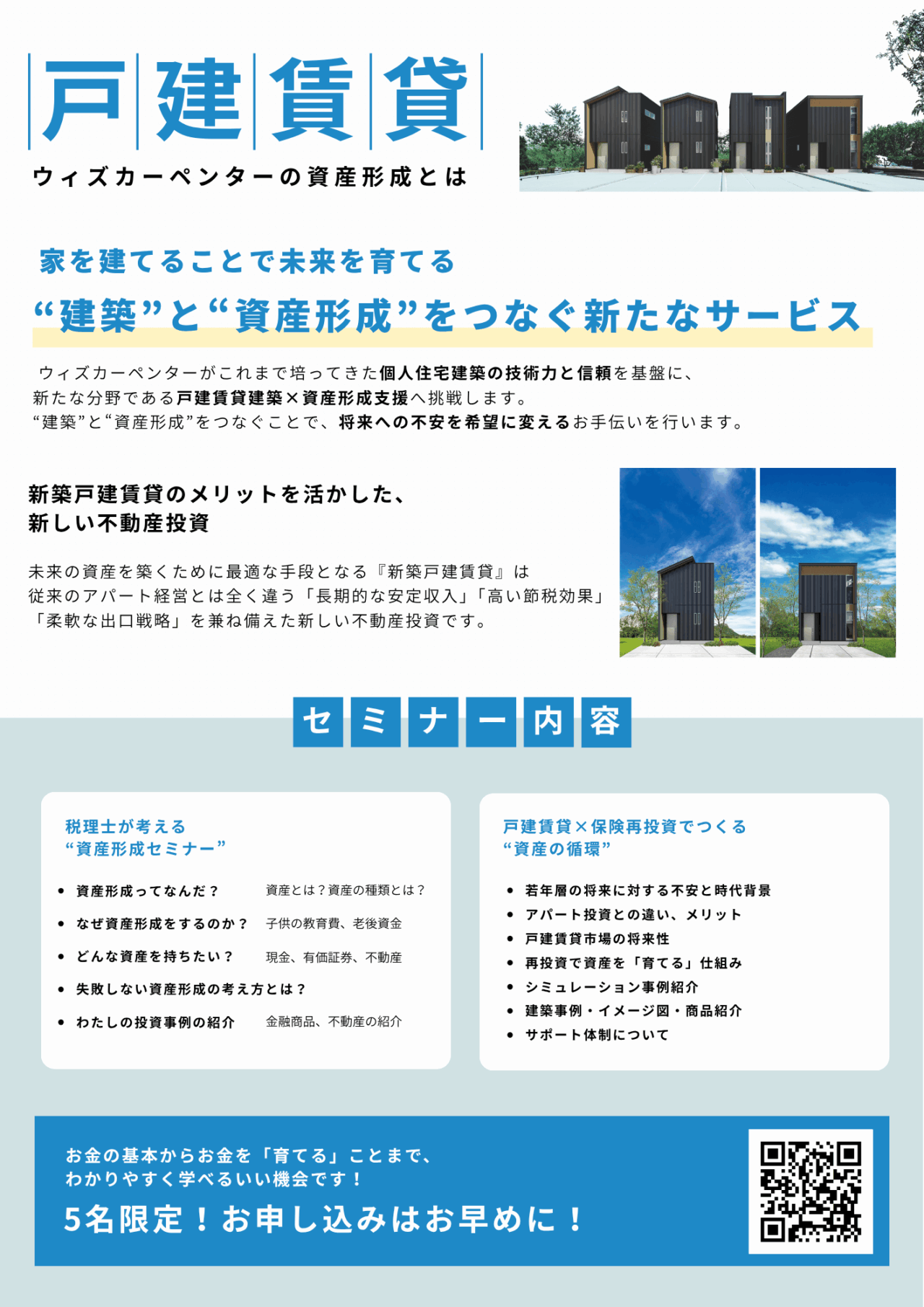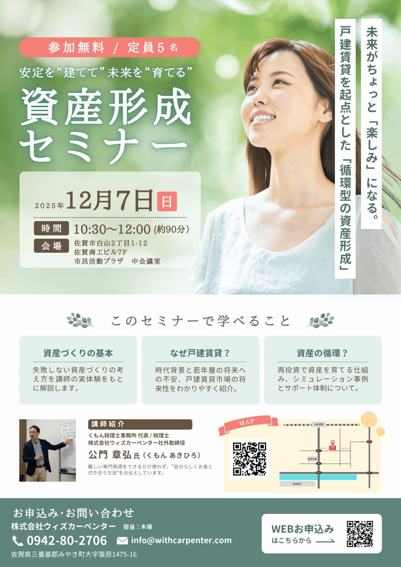 ウィズカーペンターでは12月7日10:30より、税理士に学ぶ「安定を“建てて”未来を“育てる”資産形成セミナー」を開催いたします。
