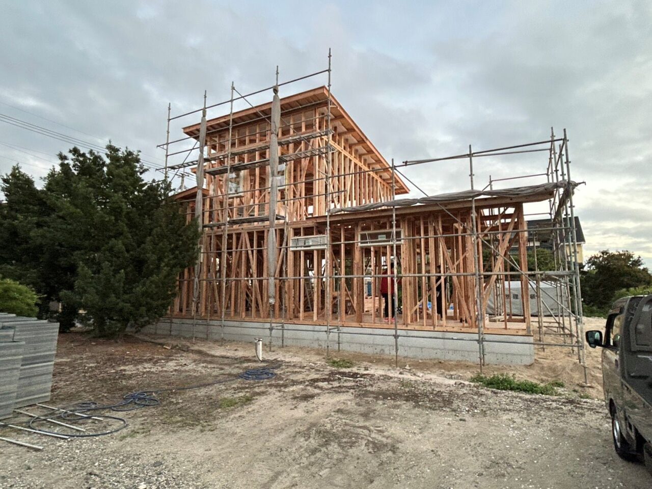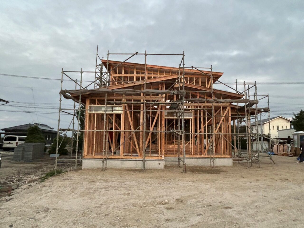 佐賀市諸富町にてJ様邸の棟上げを執り行いました。 天候にも恵まれ、朝から職人さん達が息を合わせて作業を開始されました。夕方には家の形が完成しました。完成が楽しみです(*^-^*) J様、おめでとうございます!!