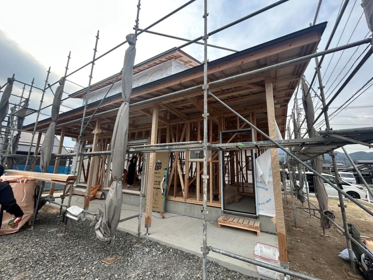 小城市三日月町にてI様邸の棟上げを執り行いました。 当日は天候に恵まれ、職人さんたちの手際のよい作業で、みるみるうちに家の形ができあがっていきました。ここから本格的に工事が進んでまいります。完成が楽しみです(*^-^*)