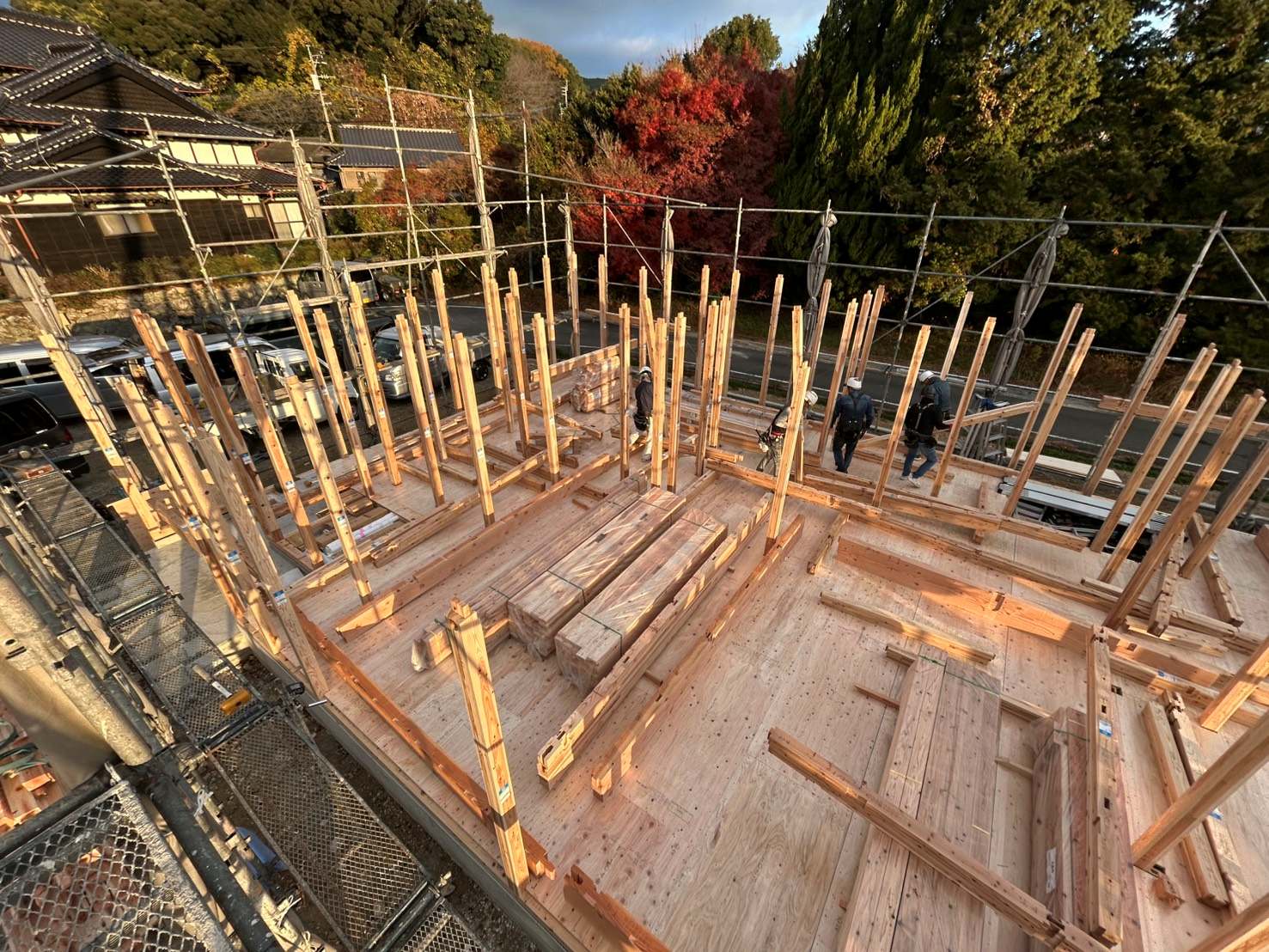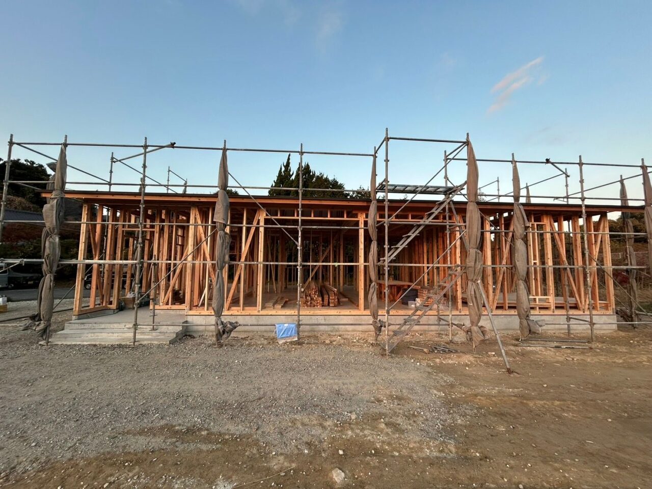 熟練した大工さんが、朝から安全確認を行いながら慎重に作業を進め、夕方には家の形が完成しました。図面で見ていた間取りが、立体的になって現れる瞬間はやはり特別なものです。